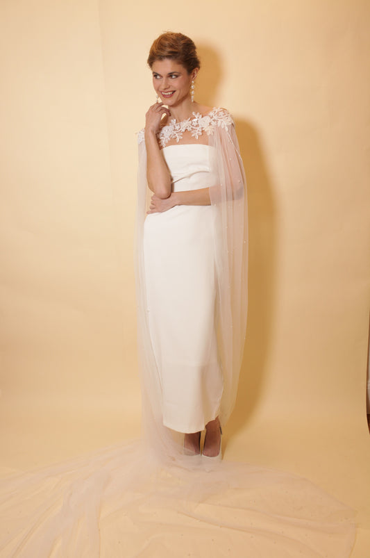 Bridal tulle cape with lace and pearls neckline, long cape with train, shoulder cover, bridal cover up, bridal accessories